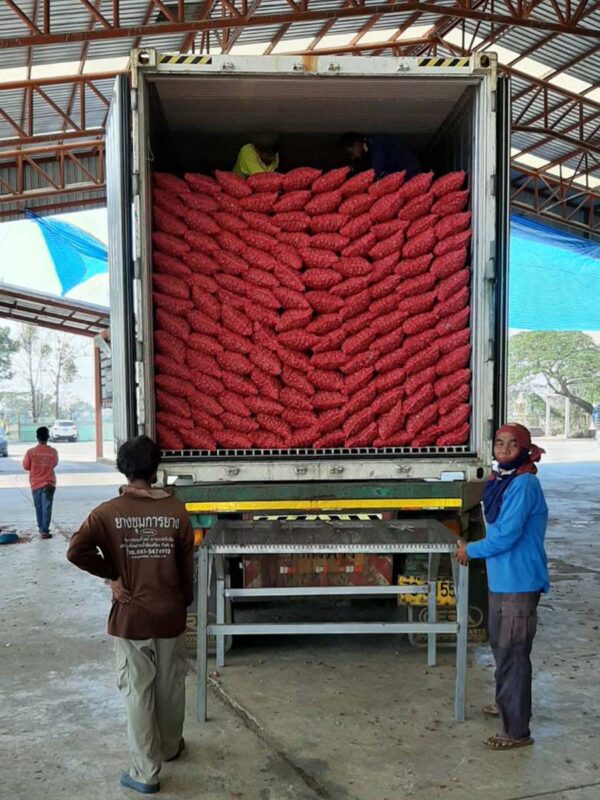 Bundle Shallot – After harvest, the farmer is removed from the plantation farm and dried with 14 days aging, then blow all the dirty and foreign object from the shallot. All shallot is trimming all root from the shallot then bundle its up